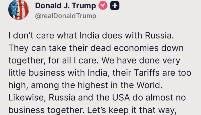 پنهنجي سوشل ميڊيا پليٽ فارم “ٽــُرٿ سوشل” تي پوسٽ ڪندي ڊونلڊ ٽرمپ چيو ته اسان اڄ وائيٽ هائوس ۾ واپاري معاهدن تي ڪم ڪرڻ ۾ تمام گهڻو مصروف آهيون، مون ڪيترن ئي ملڪن جي اڳواڻن سان ڳالهايو آهي، جن مان هر هڪ چاهي ٿو ته آمريڪا کي خوش ڪيئن ڪجي.
