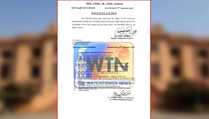 سيشن جج سجاول آصف مجید جي ھاءِ ڪورٽ ۾ رجسٽرار طور مقرري جو نوٽيفڪيشن بہ جاري ڪيو ويو آھي.