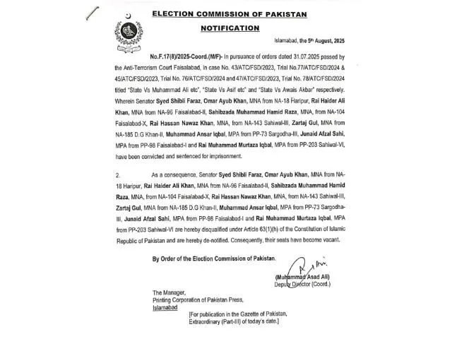 اليڪشن ڪميشن پاران اڱاري ڏينھن جاري ڪيل سرڪاري نوٽيفڪيشن ۾ ڄاڻايو ويو ته قومي اسيمبلي ۾ اپوزيشن اڳواڻ عمر ايوب خان ۽ سينيٽ ۾ اپوزيشن اڳواڻ شبلي فراز کي نااھل قرار ڏنو ويو.