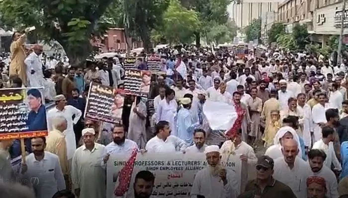 سنڌ ايمپلائيز الائنس جي سڏ تي پينشن ۾ ڪٽوتي ۽ ٻين مراعتن ۾ گهٽتائي خلاف سرڪاري ملازم مرد ۽ عورتون روڊن تي نڪري آيا.