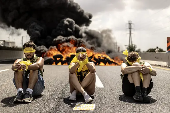 تل ابيب ۾ گذريل ڪيترن ئي ڏينهن کان احتجاجي ريليز ڪڍڻ جو سلسلو جاري آهي، ڪالهه کان جاري احتجاج دوران مظاهرين ٽائر ساڙي روڊ بلاڪ ڪيو.