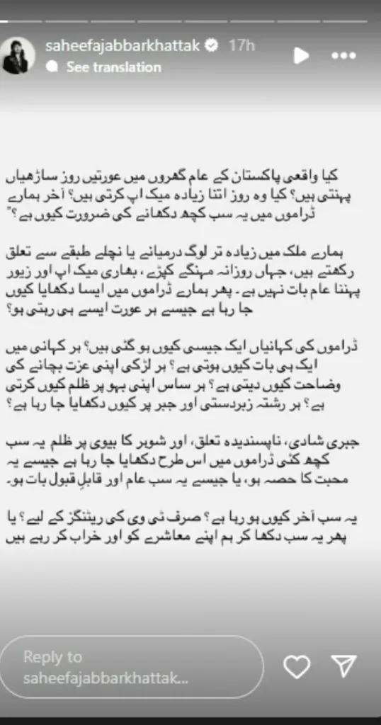 انسٽا گرام تي لکيل پنھنجي نوٽ ۾ اداڪارا ڊرامن جي مواد، اخلاقيات ۽ ڪم ڪرڻ وارين حالتن تي بھ سخت ڇوھ ڇنڊيا آھن. ھن سوال اٿاريو تھ پاڪستان جي اصلي مسئلن ۽ المناڪ واقعن تي ڊراما ڇو نه پيا ٺاھيا وڃن.